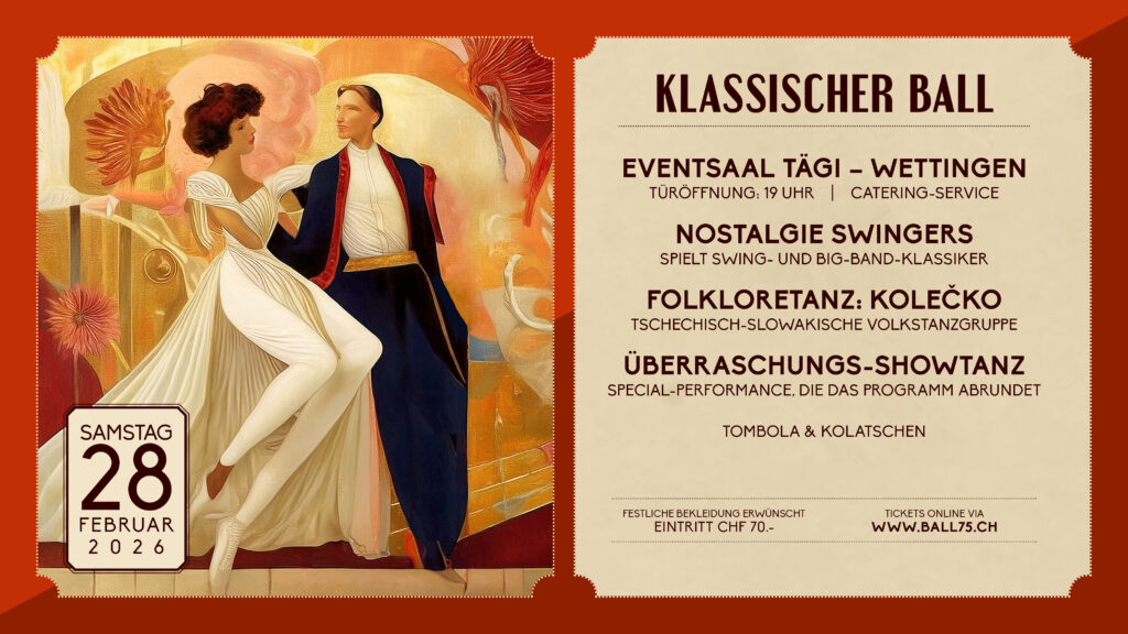 Die Strassen sind bereits weihnachtlich beleuchtet, die Schaufenster geschmückt und an vielen Orten lässt sich gemütlich beisammensitzen und Glühwein trinken. Es ist also höchste Zeit, Ihnen das neue das Datum für den nächsten, Tschecho – Slowakischen Ball mit Livemusik mitzuteilen. Tragen Sie sich also den 2. März 2024 heute noch in Ihrem Kalender ein. Getanzt, gelacht und gefeiert wird auch im neuen Jahr wieder im Eventsaal des TÄGI Wettingen. Die Nostalgie Swingers Big Band, wird mit vollem Elan für super Stimmung sorgen und alle begeisterten Tänzer:innen kommen wie jedes Jahr voll auf ihre Kosten.
